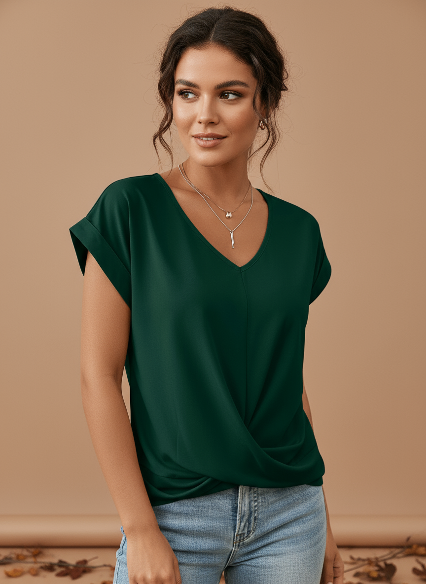 O bluză elegantă și confortabilă cu design în V și o linie care flatează silueta, ideală pentru orice ocazie.