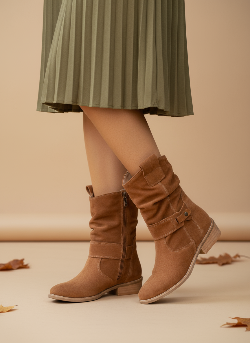Bocanci casual pentru femei din material suede, cu o potrivire confortabilă și detalii moderne în talie. Designul lejer al axului oferă un caracter boho, iar tocul jos îi face ideali pentru utilizarea zilnică. Fermuarul practic de pe lateral asigură o aplicare și o îndepărtare ușoară.