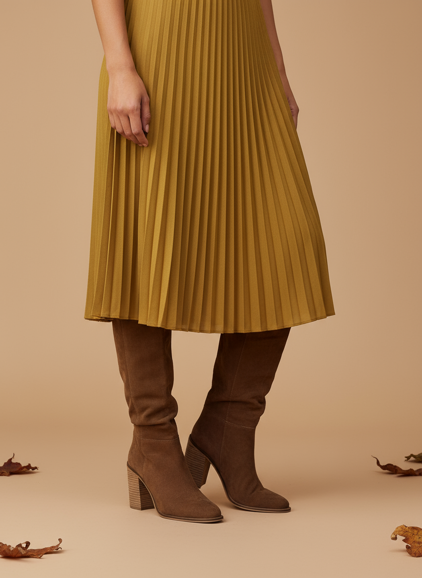 Botine înalte pentru femei din suede maro, cu un design elegant care combină stilul clasic western cu linii moderne. Axul înalt îmbrățișează piciorul, oferind feminitate și eleganță, în timp ce tocul stabil conferă înălțime și confort. O piesă atemporală care poate fi purtată cu rochii, fuste sau blugi skinny, creând ținute elegante cu stil.