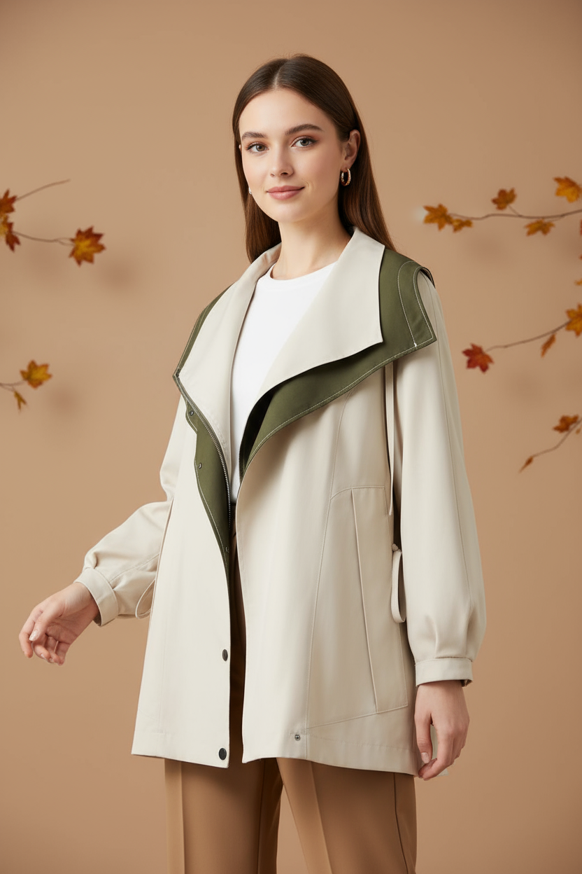 Jachetă **bicoloră pentru femei** în nuanțe de khaki și crem, care combină estetică minimalistă cu un caracter modern. Dispune de mâneci largi cu elastic, fermoar și nasturi pentru o potrivire perfectă, precum și o linie confortabilă care o face ideală pentru apariții zilnice cu stil. Materialul său ușor oferă libertate de mișcare și eleganță în fiecare look.