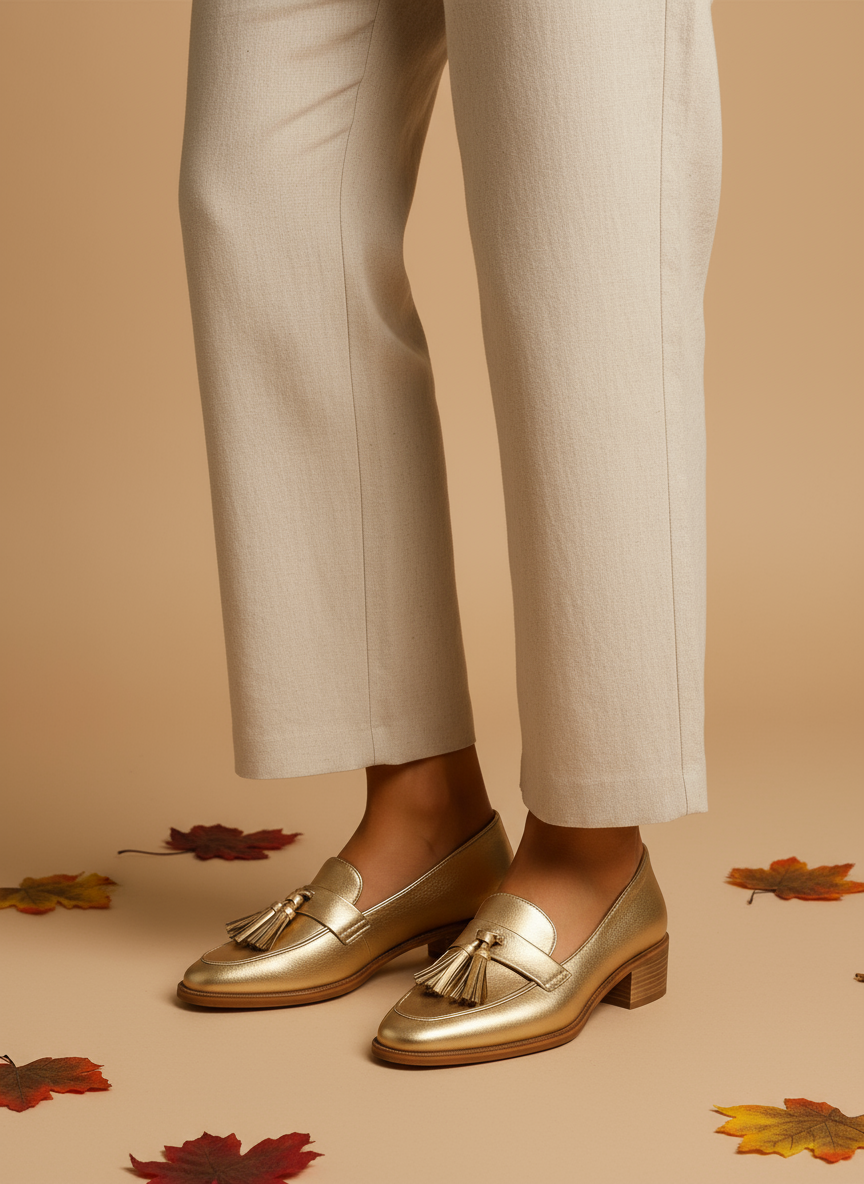 Descoperiți mocasinii noștri eleganți cu vârf subțire și rotund și ciucuri impresionante pentru un aspect rafinat și relaxat. Finisajul lucios adaugă o notă de eleganță fiecărui pas, în timp ce tocul jos și structura moale asigură confort în timpul purtării.