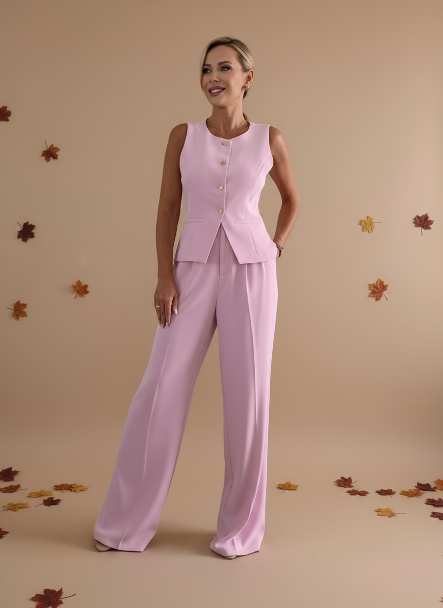 Setul nostru elegant preferat este combinația perfectă de stil, confort și lux discret – ideal pentru femeile care doresc să iasă în evidență cu eleganță în fiecare apariție. Topul fără mâneci combinat cu pantalonii cu o linie confortabilă creează o apariție șic și modernă pentru orice moment al zilei.